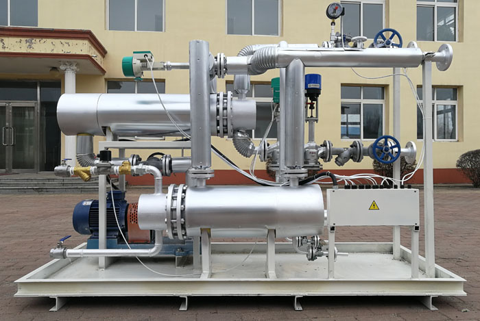 工作原理:將高溫熱源換熱給低溫有機熱載體或高溫有機熱載體混入低溫有機熱載體已達到用熱設備的溫度要求。